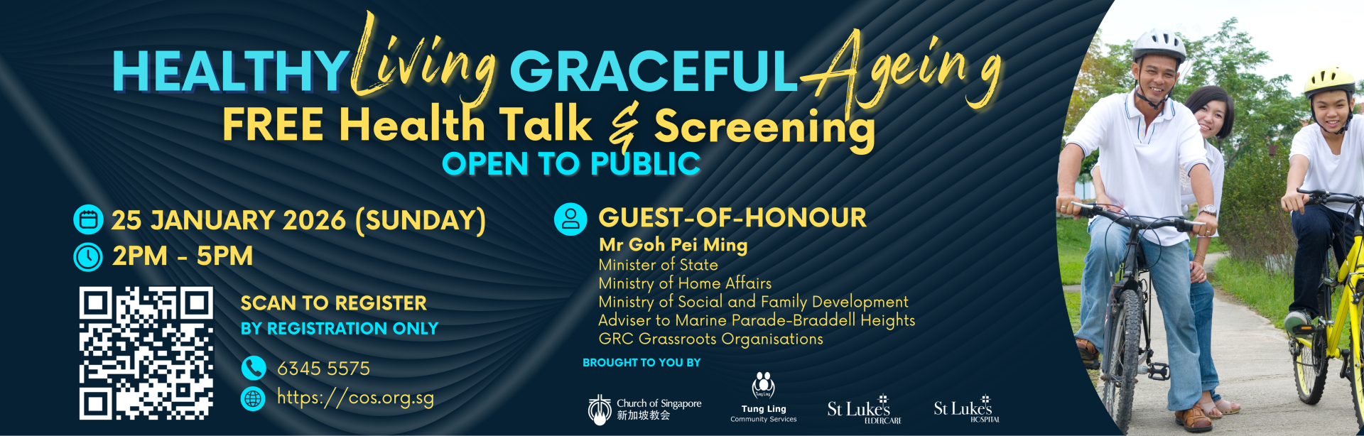 A community health event featuring free health talks and screening, with various engagement booths for healthy living and graceful ageing.